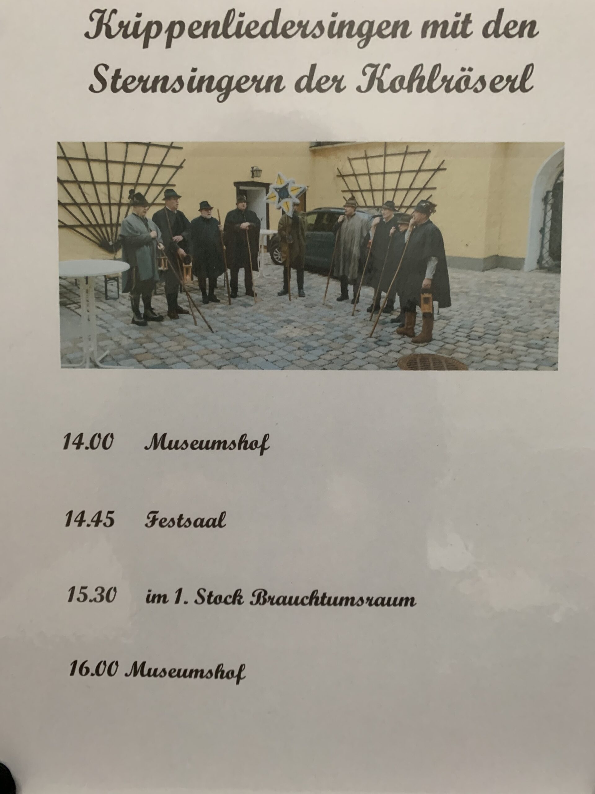 Für eine besonders feierliche Stimmung sorgt eine Abordnung des Männergesangsvereins „Kohlröserl“, die mit Weihnachtsliedern den Museumsbesuch musikalisch umrahmt. Auch die Heiligen Drei Könige werden dem Museum einen Besuch abstatten und Groß wie Klein erfreuen.